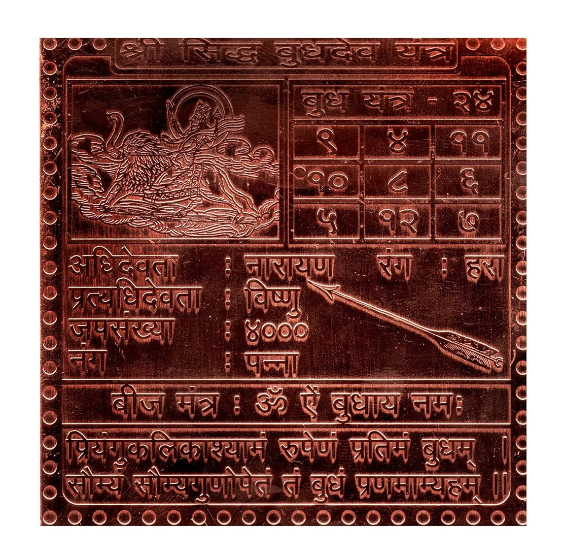 Siddh Budh Yantra pertains to planet Budh alias Mercury. You imbibe good positive qualities of Mercury Yantra. Siddh Budh Yantra works well to sharpen, intelligence and acquiring knowledge. You are able to take the right decision, set goals and achieve the same. It adds to your sense of creativity. You develop a good sense of humor and become kind of witty in conversation. Career oriented is to achieve higher growth and hold a very responsible position in a reputed organization. A business person succeeds is able to score over competitors and hold reputation in the market as a trustworthy business person. Siddh Budh Yantra leads to a healthy financial position and prosperity in life.